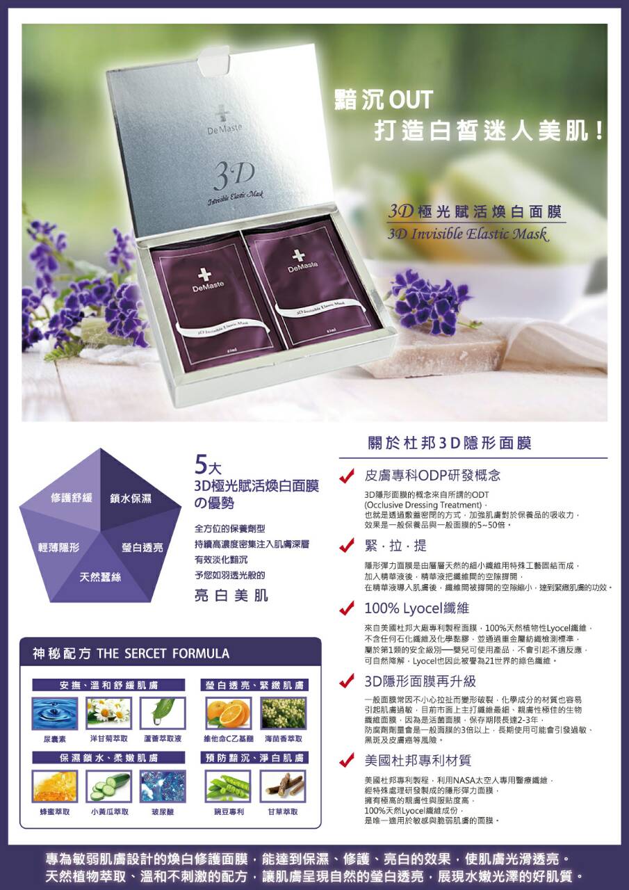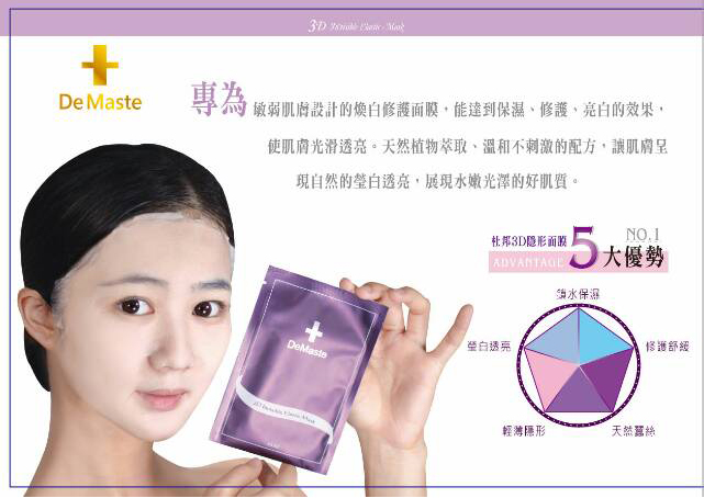 海王星3D美肌面膜 (皮膚專科診所、醫美會所、醫師指定使用) 5大功能:鎖水保濕、瑩白透亮、天然蠶絲、輕薄隱形、修護舒緩 5大特色:皮膚專科ODP研發概念、緊.拉.提、100% Lyocel纖維、3D隱形面膜再升級、 美國杜邦專利材質